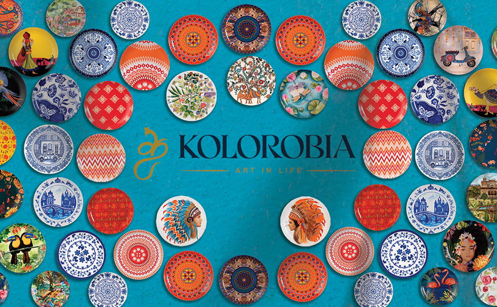 KOLOROBIA offers decorative wall plates of world-class quality and exceptional craftsmanship. Our plates feature unique patterns that bring together cultural heritage worldwide. They are ideal for use in homes, hotels, and offices. Each plate is carefully curated by skilled artists and finished with a glossy coat, adding charm and elegance to any room. Made from high-quality ceramic, our plates make perfect gifts for any occasion. Our fine collection includes various designs and sizes to cater to your needs. Experience unique and stylish designs with our wall decor plates. These ceramic plates are perfect for gifting to your loved ones and are sure to bring a smile to their face. KOLOROBIA's premium quality wall plates are made from chip-resistant, fine bone china material, featuring attractive multicolour designs in toughened strong ceramic. They are durable, scratch-resistant, super white, and lightweight. Our products are made in India, and we take pride in offering the finest quality products to our customers.